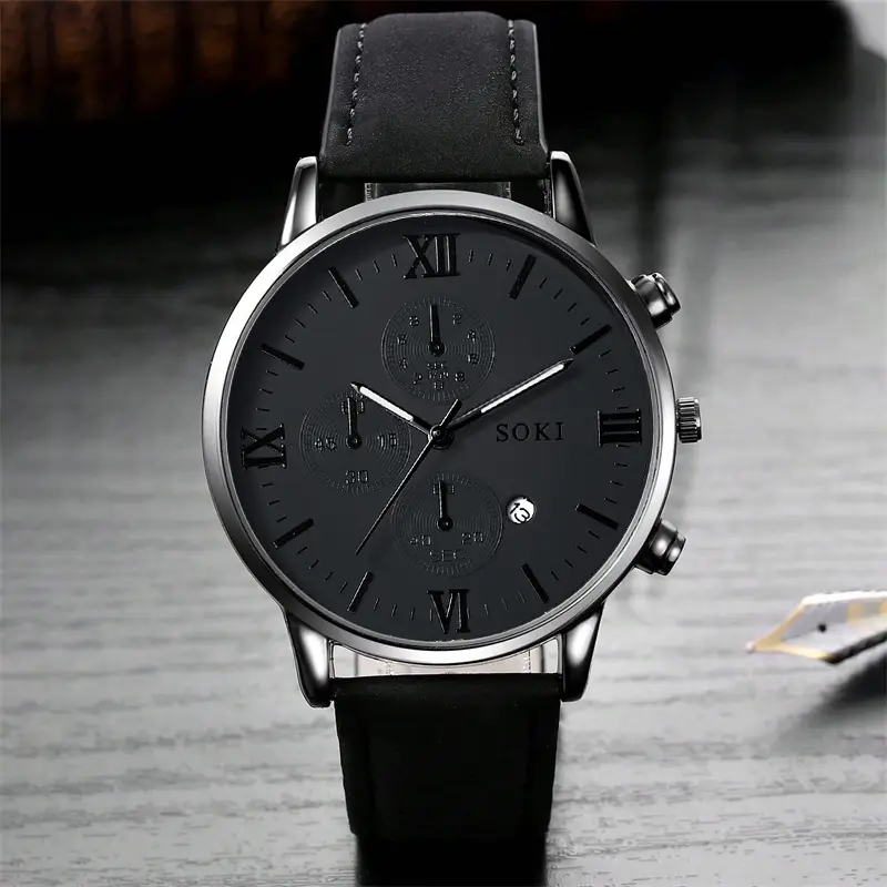 Make a bold statement with this timeless and sophisticated SOKI wristwatch. This classic men’s timepiece features a sleek, monochromatic all-black dial that is both modern and elegant. The dial is detailed with contrasting Roman numerals and intricate subdials, adding a touch of classic functionality to its minimalist design. The polished silver-toned case provides a striking contrast, while the comfortable black leather-like strap ensures a perfect fit for all-day wear. Whether you’re heading to a business meeting or a casual event, this watch is the perfect accessory to elevate your style. Its versatile design and meticulous craftsmanship make it an essential addition to any wardrobe.